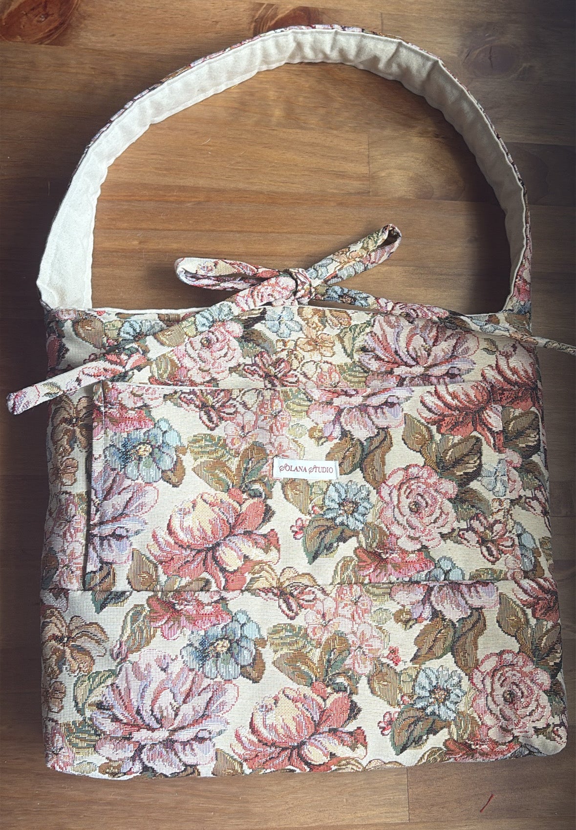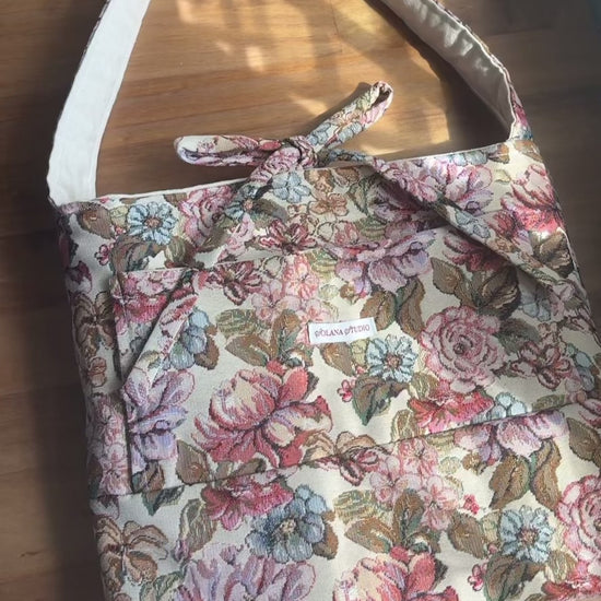 The Large Bow Bag features a front pocket, magnetic clasp, and an elegant bow tie closure. Spacious enough to fit up to a 14” laptop, it’s perfect for work, study, or travel. Lined with durable canvas fabric.